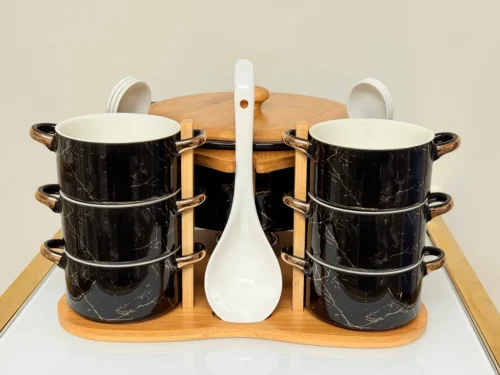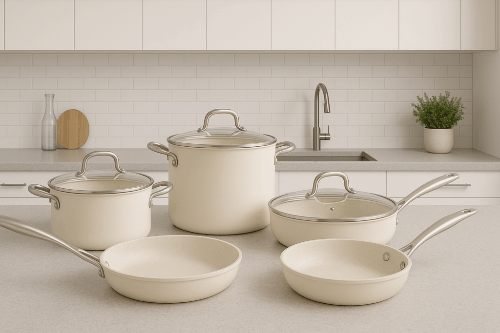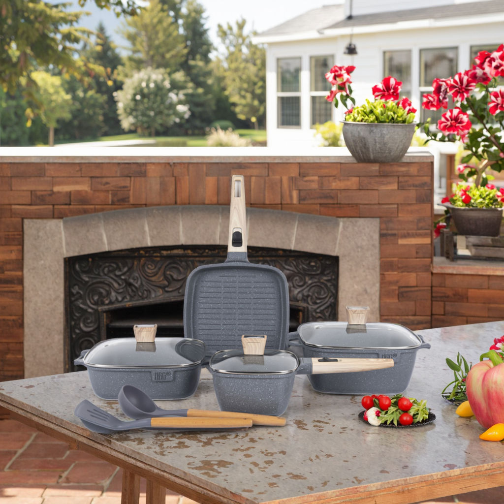 This 11-piece cookware set includes pots and pans of various sizes, designed in a modern gray finish. Perfect for everyday cooking, the set comes with matching lids and essential utensils, making meal preparation simple and efficient.
